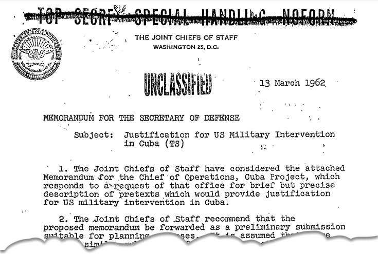 A (since declassified) ‘Top Secret’ memo dated March 13, 1962, addressed to the Secretary of Defense and signed by then-Chairman of the Joint Chiefs of Staff makes for interesting reading. Its subject line reads: Justification for US Military Intervention in Cuba.