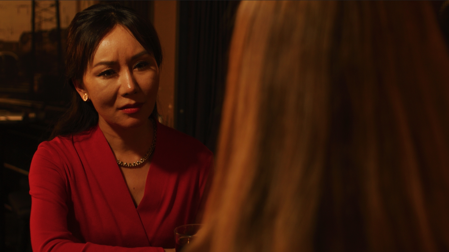 Chinese American actress Crystal J. Huang (left) plays opposite Castello in Anno 2020 bar scene.